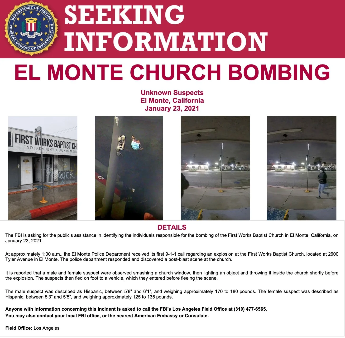 While the FBI and El Monte Police Department have not produced a confirmed motive or successfully identified suspects, that has not stopped Pastor Bruce Mejia from alleging that it was “LGBT terrorists” that bombed his church around the time protests were planned from a local LBGT-friendly group in El Monte against First Works Baptist Church.